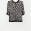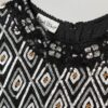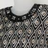 Vintage Frank Usher sequin top in black and white with gold detail. This beautiful 90s sequin top by Frank Usher features a round neck, is fully lined, has short sleeves, shoulder pads, and a full length back zip closure and a hook and eye closure on the back of the neck. Made from a heavyweight synthetic blend.