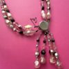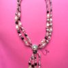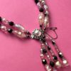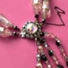 This stunning vintage necklace features two strands of aurora borealis and foil glass beads. The bottom (front) features a large aurora borealis glass stone and four small beaded lengths that form drops. Some of the beads are light pink, and some are a mix of black and silver or aurora borealis. This beautiful example fastens, unusually, at the front. It also has a ‘safety chain’ to protect the necklace from falling should the clasp become loose.
