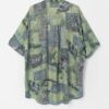 Vintage green silk shirt with blue abstract pattern. This 90s soft green silk shirt features a blue abstract pattern, a button closure, one chest pocket with a button closure, short sleeves and has a relaxed fit. Made from a lightweight silk.