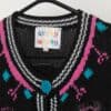 Vintage handknitted colourful cardigan with 3D flowers and characters. This amazing black 80s cardigan features a colourful 3D knitted floral and character pattern throughout, a relaxed crew neck, two open pockets above the hem and a large blue button closure. Made from a heavyweight soft cotton blend with a relaxed fit.
