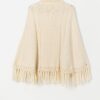 Vintage handknitted cream poncho with fringe detail. This beautifully knitted cream poncho features a cute button closure, a hight neck and a fringed hem. Made from a heavyweight wool blend.