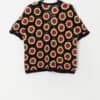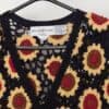 Vintage handknitted The Eagle’s Eye sunflower cardigan. This navy blue 90s cardigan by The Eagle’s Eye features beautiful yellow, brown and red sunflowers, a deep V-neck, material buttons and short sleeves. Handknitted with a heavyweight soft cotton.