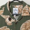 Vintage Hawaiian fishing shirt by Guy Harvey. This green 90s Hawaiian shirt by Guy Harvey features a brown floral, leaf and swordfish pattern, an open collar, a button closure, one open chest pocket and short sleeves. Made from a mid-weight cotton blend.
