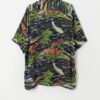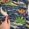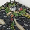 Vintage Hawaiian surf shirt. This grey Hawaiian shirt features a vibrant floral and leaf print with surf boards and surfers riding the waves. This shirt also features a button closure, one chest pocket with a button closure, short sleeves and is made from a mid-weight synthetic material.
