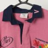 Vintage Helensburgh RFC rugby polo. This Y2K pink polo from the Rebel Tour, Cardif 2001 features, sponsorship embroidery on the front, grey stripes on the centre and arms, a button closure and short sleeves. Made in Great Britain from a heavyweight cotton blend.