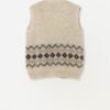 Vintage knitted wool vest by Eiden Knit. This 1970s cream and brown knitted vest has edge to edge with no fastenings and features a geometric pattern around the waist and is made in Iceland from a mid-weight, slightly coarse, pure wool.