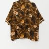 Vintage linen Hawaiian shirt in golden brown. This golden brown shirt features an orange floral and brown animal print pattern. This shirt also features short sleeves, a coconut button closure and one open chest pocket. Made from a lightweight linen blend.