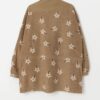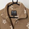 Vintage long floral fleece jacket in brown and white. The long brown fleece features a white and purple floral pattern, a full length zip closure, two open side pockets and a high neck. Made from a soft, heavyweight synthetic blend.