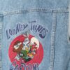 Vintage Looney Tunes denim vest with large embroidered back. The stunning vest from the 1990s is in a lovely light blue denim and features two chest pockets with button closure, silver branded Warner Bro buttons and a stunning embroidered design on the back with some of the classic Looney Tunes cartoon characters including Bugs Bunny, Daffy Duck, Yosemite Sam, Marvin the Martin and the Tasmanian Devil. Made from a soft, lightweight cotton.