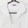 Vintage new romantics ruffle lace detail shirt. This late 70s / early 80s white shirt features a lace ruffle front, long sleeves with elasticated cuffs and a V-neck. Made from a mid-weight cotton blend.