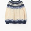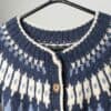 Vintage Norwegian cardigan with patterned yoke. This beautiful 1960s cream, pastel blue and navy wool cardigan features a Scandinavian yoke neck with a mock collar and real wood buttons. Made from a heavyweight, slightly coarse, wool. A perfect winter cardigan!