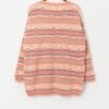 Vintage peach 3D knit oversized jumper. This 90s/Y2K pastel peach jumper features a blue and pink geometric pattern and a white 3D knit. This jumper also features a crew neck, long sleeves and is made from a soft, mid-weight synthetic material.
