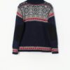 Vintage quarter zip knitted jumper. This navy jumper features a snowflake geometric design in white, grey and red. This jumper also features a warm lining, quarter zip and high neck, has two zipped side pockets and a drawstring hem. Made from a soft, heavyweight wool with a polyester and polyurethane lining.