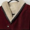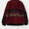 Vintage red suede Aztec jacket with horse pattern. This 80/90s jacket in deep red and black features a geometric and horse pattern on the chest, back and sleeves, a faux fur collared neckline, two open side pockets and a snap button closure. Made from a heavyweight leather with a synthetic lining and padding – A perfect autumn/winter jacket!