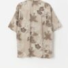 Vintage silk Hawaiian shirt with tropical pattern. This pastel brown Hawaiian shirt features a brown and white tropical pattern, one open chest pocket, a wooden button closure and short sleeves. Made from a heavyweight silk.