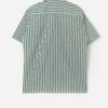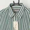 Vintage striped shirt in blue and yellow, deadstock. This 1980s white shirt with blue and mustard yellow stripes features a pointed collar, a transparent button closure and short sleeves. Made from a lightweight polyester blend.