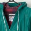 Vintage women’s green zip up hooded raincoat jacket with plaid lining. This 90s green rain jacket by Misty Harbour, features a warm, plaid lining, a drawstring hood, a zip closure, two pockets above the hem and is made from a heavyweight synthetic blend.
