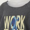 Vintage ‘Work It Out’ cropped sweatshirt top. This dark grey cropped sweatshirt features a round neck, a fleece lining, very short sleeves and has ‘Work It Out’ printed in yellow text with a blue bodybuilding pose in the centre. Made from a mid-weight cotton blend.
