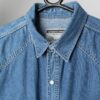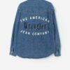 Vintage Wrangler western denim shirt with large text on the back. This Wrangler shirt in light blue, features a white snap button closure with a classic white button closure on the collar. This shirt also features off white piping throughout, two chest pockets with matching black and white snap button closures and snap button cuffs. This shirt also features the Wrangler logo in brown on the left chest pocket and has large branding on the back.