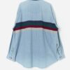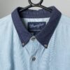 Vintage Wrangler western shirt in denim blue. This 90s Wrangler long sleeve shirt features a pocket on the left of the chest with a button closure, a button down collar and buttoned cuffs. This beautiful denim blue shirt features a navy blue collar and navy, green, burgundy and beige stripes along the chest. Made from a mid-weight, soft cotton.