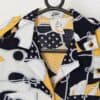 Vintage yellow and blue abstract blouse. This 1980/90s blouse features a navy blue, bright yellow and white abstract design which includes ropes and stars. This blouse also features shoulder detail, two chest pockets with button closures, a full length button closure, an open collar and is made from a lightweight synthetic material.