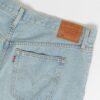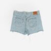 Pale blue Levis 501 cut off short shorts. These pale blue Levis 501 cut off shorts feature two front pockets, two back pockets, a button fly, the brown Levis patch is on the waist (back right) and the red Levis tab is on the back right pocket. Made from a mid-weight cotton.