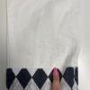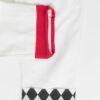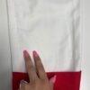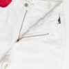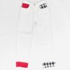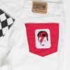 Women’s customised David Bowie white jeans. These customised white jeans feature two front pockets customised with one red and one black and white diamond pattern on each and two back pockets with one black and white diamond pattern and one red pattern with an amazing David Bowie embroidered patch. These jeans also feature one red hem and one black and white diamond patterned hem, belt loops and has a zip fly. Made from a heavyweight cotton.