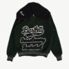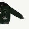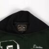 Vintage Hawks varsity jacket in forest green by The Original Holloway. This letterman jacket features a stretchy knit hem and cuffs, a snap button closure, two open pockets, is fully lined and a sailor collar. Made in the USA from a heavyweight wool and synthetic blend.