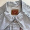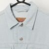 Women’s Levis cropped trucker jacket in pale blue. This pale blue cropped denim jacket by Levis features the Levis red tab on the left chest pocket, a full length button closure, two chest pockets with button closures, an adjustable hem and buttoned cuffs. Made from a mid-weight cotton.