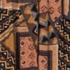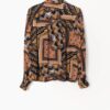Womens vintage 90s blouse with crazy orange and black geometric aztec print. Made in Italy. The blouse features gold effect buttoned collar and cuffs, and a concealed clear plastic buttoned front, Really love the abstract colourful design of this blouse! Our recommended size: Large Label Says: No size label Condition: Very good vintage condition. Material: No label. Likely synthetic. We’ve provided garment measurements below and suggest you compare these to a similar garment you own to determine a good fit. Measurements are taken flat and doubled for waist and hip.