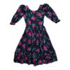 Women’s vintage 90s Laura Ashley floral dress with full skirt and 3/4 length sleeves. This is a super sweet 50s style cottage-core floral dress, easily dressed up or down! Classic Laura Ashley flowery pattern. The sleeves have a slight puff at the shoulder, the chest is a deep v with a wrap style and the skirt is full and pleated.