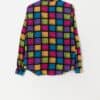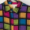 Women’s vintage silk shirt with bright square pattern. This beautifully bright blouse features a colourful square pattern, long sleeves, buttoned cuffs and a full length button closure. Made from a lightweight silk.
