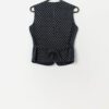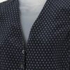 Women’s vintage silk waistcoat in navy blue. This 90s/Y2K navy blue waistcoat features a subtle geometrical pattern, a button closure, a deep V-neck, is fully lined, has one open pocket above the hem and a back tie closure. Made from a lightweight silk.