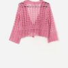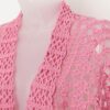 Y2K vintage pink crochet cropped cardigan with tie front. This beautiful pink Y2K crochet cardigan features a deep V-neck and a front tie closure. Made from a mid-weight cotton blend.